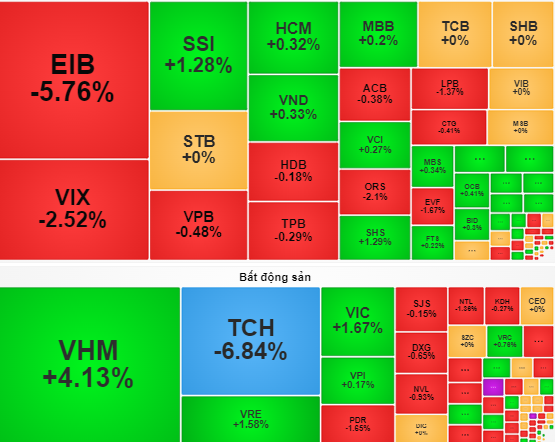 Lúc 11 giờ, nhiều cổ phiếu thuộc ngành ngân hàng đồng loạt rớt giá. Đáng chú ý nhất là mã cổ phiếu của Ngân hàng Xuất nhập khẩu Việt Nam (Eximbank) đã bị đầu tư bán tháo.