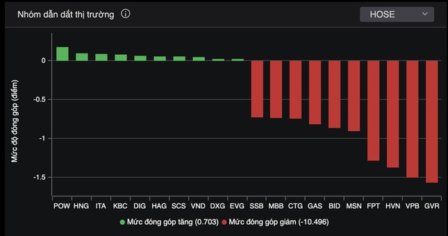 Kết phiên giao dịch, 10 mã gây ảnh hưởng tiêu cực nhất lấy đi gần 10,5 điểm của chỉ số chính. Dẫn đầu là GVR. VPB, HVN, FPT, MSN, BID, GAS, CTG… lần lượt theo sau. Rổ VN30 chỉ còn duy nhất POW giữ sắc xanh, tăng 2%.