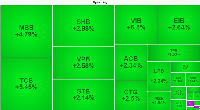 Cụ thể, 20 mã niêm yết trên sàn HoSE và HNX tăng từ 0,6%-9,5%. Trong đó, đáng chú ý là các mã: VIB (tăng 6,5%), VPB (tăng 2,5%), VCB (tăng 0,75%), TCB (tăng 5,4%), MBB (tăng 4,7%), ACB (tăng 2,3%), CTG (tăng 2,5%)…
