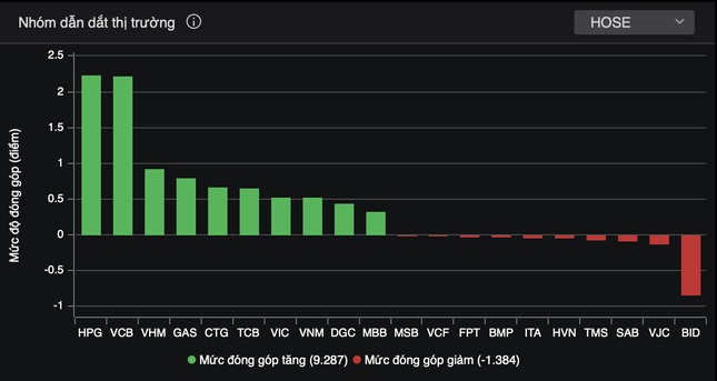 Đóng góp tích cực vào đà tăng thị trường còn có các mã vốn hoá lớn khác trong rổ VN30, như VCB, VHM, GAS, CTG, TCB… VCB kéo chỉ số chính tăng hơn 2 điểm, tương đồng với sự ảnh hưởng của HPG. Tại nhóm VN30, 21/30 cổ phiếu tăng giá. Diễn biến tích cực cũng lan toả trên nhiều nhóm ngành, 380 cổ phiếu tại HoSE tăng giá. Các ngành có sức ảnh hưởng như ngân hàng, bất động sản, chứng khoán… cùng ghi nhận cổ phiếu khởi sắc.
