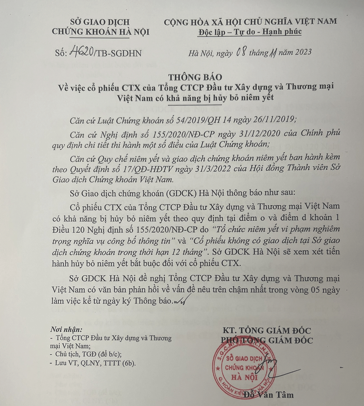 Sở Giao dịch chứng khoán Hà Nội (HNX) vừa công bố thông tin về việc cổ phiếu CTX của Tổng Công ty cổ phần Đầu tư xây dựng và Thương mại Việt Nam (CTX Holdings) có khả năng bị hủy bỏ niêm yết.