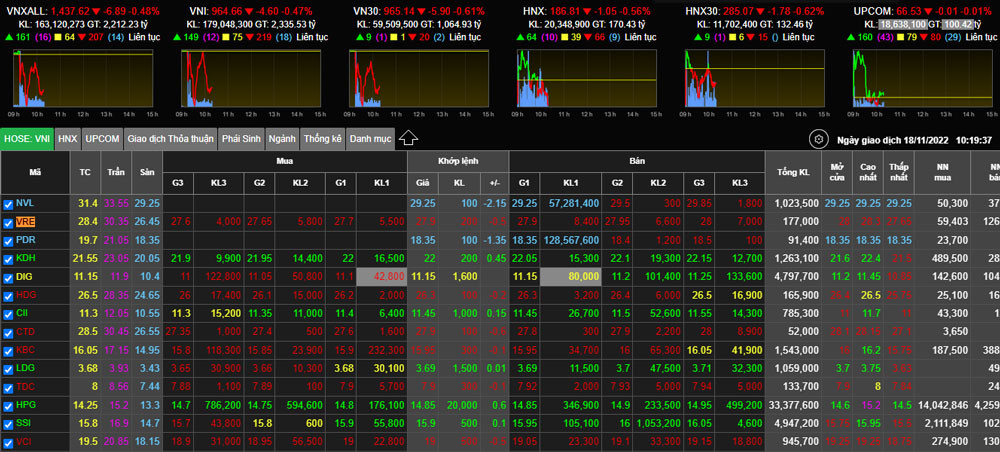 VN-Index đi ngang trong phần lớn buổi sáng 18/11, ở quanh 969 điểm. Mức này cao hơn khá nhiều so với đáy 873 điểm ghi nhận lúc 10h sáng 16/11, nhưng còn thấp hơn rất nhiều so với đỉnh trên 1.520 điểm hồi đầu tháng 4/2022.