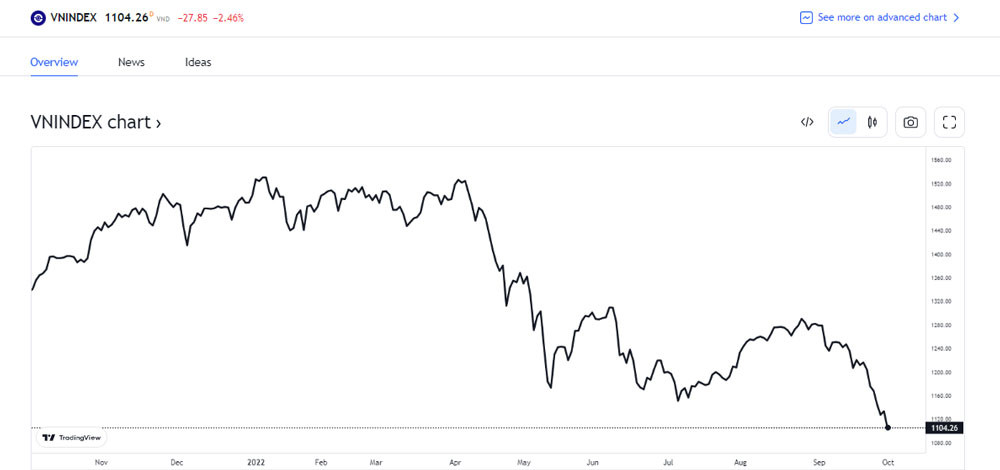 Sáng 3/10, đa số cổ phiếu trên cả 3 sàn HoSE, HNX và Upcom đều giảm mạnh. Chỉ số VN-Index giảm gần 27 điểm về ngưỡng 1.105 điểm, thấp hơn 27% so với đỉnh ghi nhận hồi đầu tháng 4/2022.