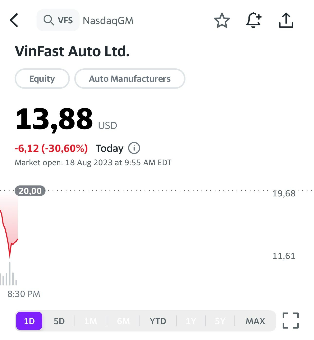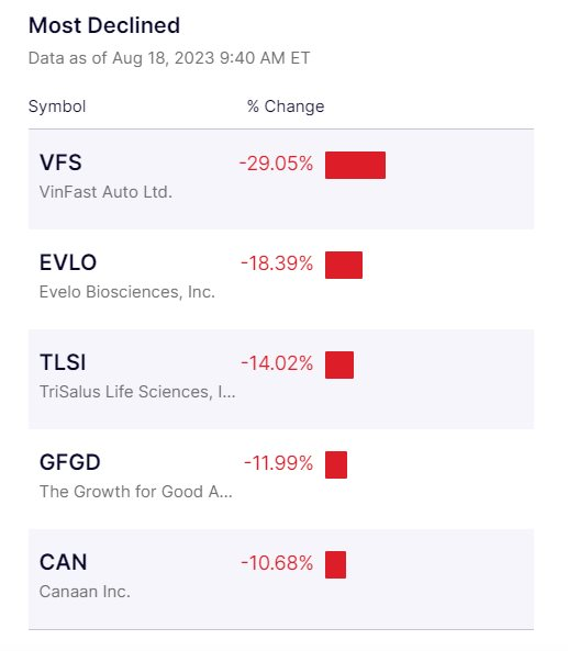 Mở cửa phiên giao dịch ngày 18/8, cổ phiếu VFS của VinFast xác lập giá mở cửa là 19,64 USD rồi nhanh chóng giảm tiếp. Đến 9h55 (EDT) cổ phiếu này giảm 30,6% còn 13,88USS. Trước đó VFS từng giảm gần 34% xuống còn 13,25 USD.
