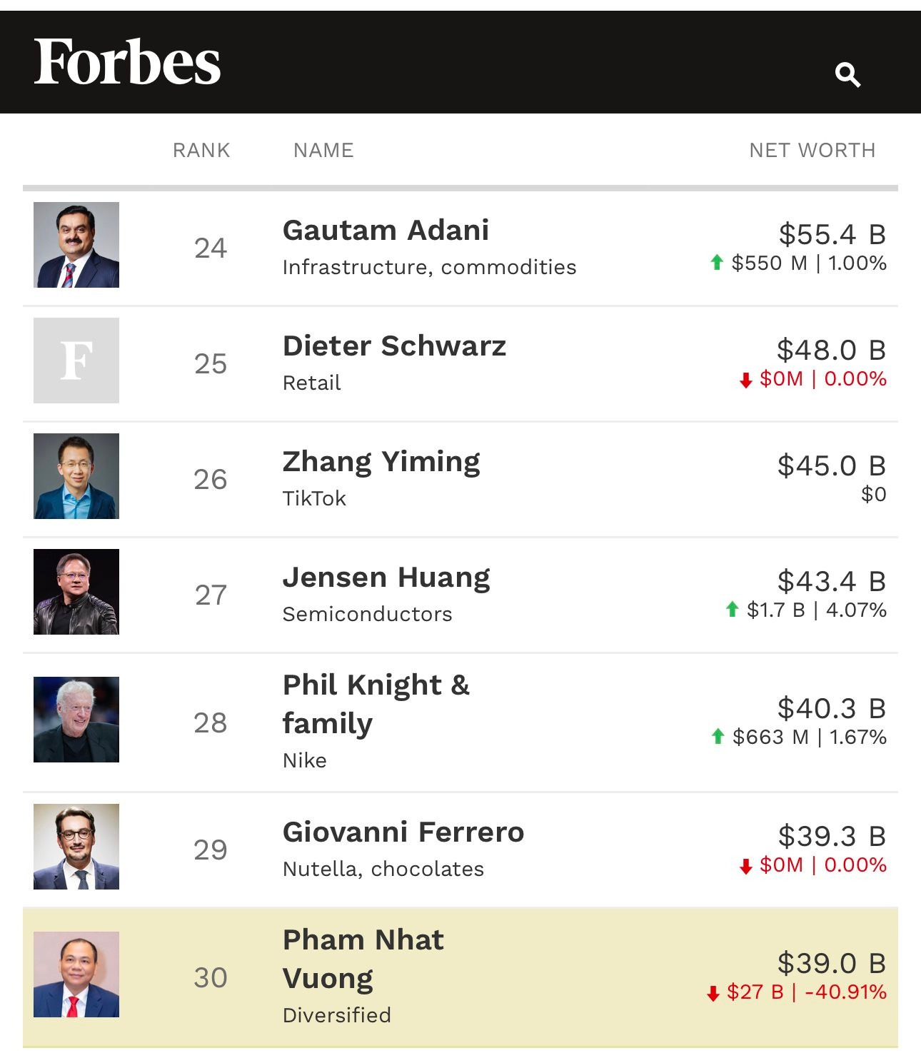 Cùng với diễn biến của cổ phiếu VFS, khối tài sản của tỷ phú Phạm Nhật Vượng đã giảm 27 tỷ USD còn 39 tỷ USD, tụt xuống hạng 30 trên bảng xếp hạng những người giàu nhất hành tinh.