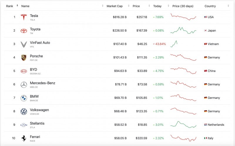 Với mức thị giá hiện nay, tổng giá trị vốn hoá thị trường của VinFast đã mất hơn 84 tỷ USD chỉ sau một ngày giao dịch, xuống còn 107,4 tỷ USD. Tuy nhiên, VinFast vẫn đang tiếp tục giữ vị trí Top 3 hãng sản xuất ô tô lớn nhất thế giới (sau Tesla và Toyota) về giá trị vốn hoá thị trường.