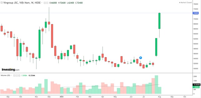 VIC tiếp tục lập đỉnh mới trong năm nay, tạm kết phiên sáng tăng 6,6% lên 72.400 đồng/cổ phiếu. Chỉ qua 1 tháng, VIC đã tăng giá gần 43%, sau liên tiếp những thông tin tích cực về kết quả kinh doanh, và câu chuyện niêm yết trên sàn chứng khoán Mỹ của Vinfast. VinFast dự kiến niêm yết trên sàn Nasdaq vào ngày 15/8 sau khi cổ đông Black Spade đã thông qua kế hoạch hợp nhất kinh doanh tại Đại hội cổ đông đặc biệt hôm 10/8.