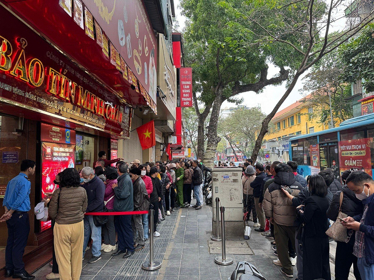 Theo ghi nhận của VietNamNet sáng 30/1, khu vực phố Trần Nhân Tông (quận Hai Bà Trưng, Hà Nội) đã nhộn nhịp từ rất sớm. Nhiều cửa hàng lớn ghi nhận cảnh người dân xếp hàng dài chờ giao dịch, trong đó không ít người có mặt từ 3 giờ sáng.