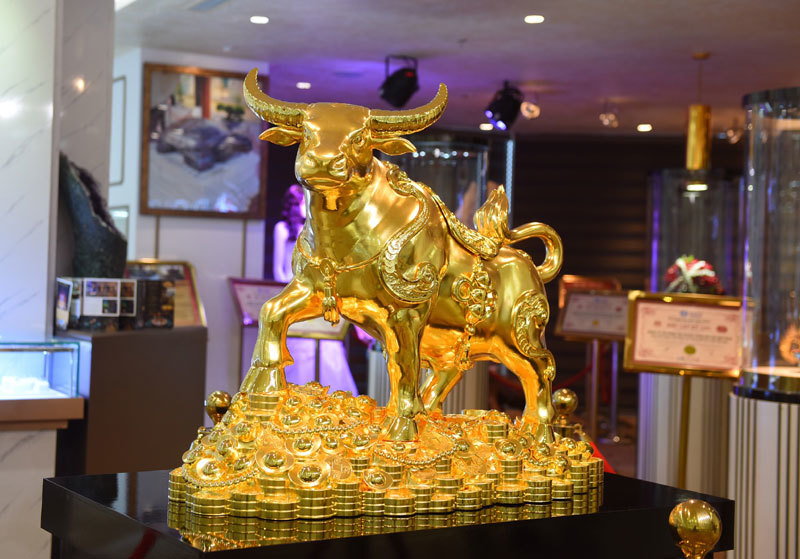 Đáng chú ý, có doanh nghiệp còn chế tác trâu vàng 999.9 nguyên khối cao cao 868mm, nặng 20 kg - linh vật may mắn của năm mới. Con trâu vàng thuộc hàng khủng này sẽ được đặt tại cửa hàng để khách tới mua vàng được chiêm ngưỡng.