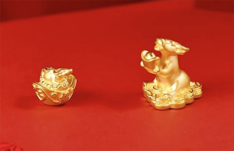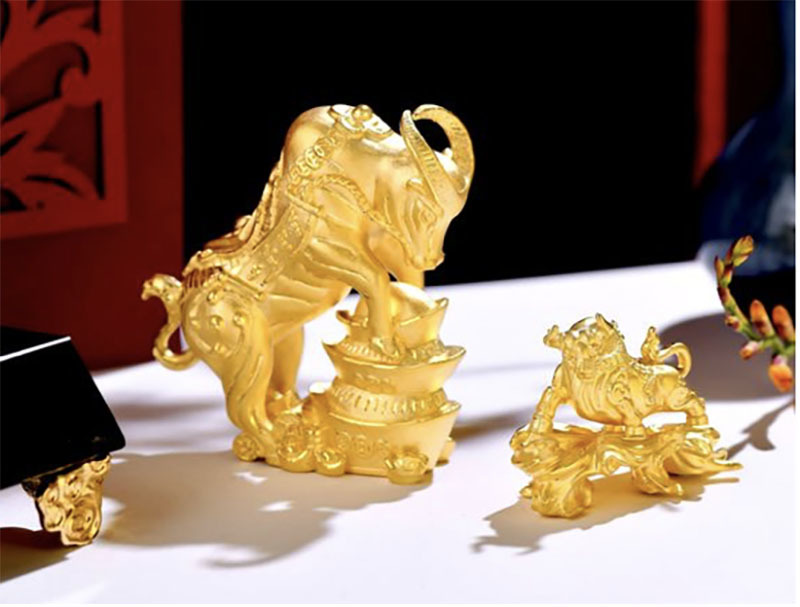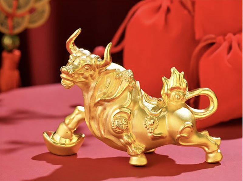 Vì là năm Tân Sửu nên dịp vía Thần Tài năm nay, trâu vàng trở thành sản phẩm chủ đạo. Cũng chính bởi vậy, linh vật này được chế tác thành đủ các kiểu dáng khác nhau, từ tượng trâu vàng cho đến đồng vàng có hình trâu vàng, cho tới charm vàng hình trâu ngộ nghĩnh... Trọng lượng mỗi sản phẩm dao động từ 1-5 chỉ. Với những tượng trâu vàng thì khối lượng vàng 999.9 dùng để đúc lên tới cả lượng, thậm chí hàng chục lượng vàng.