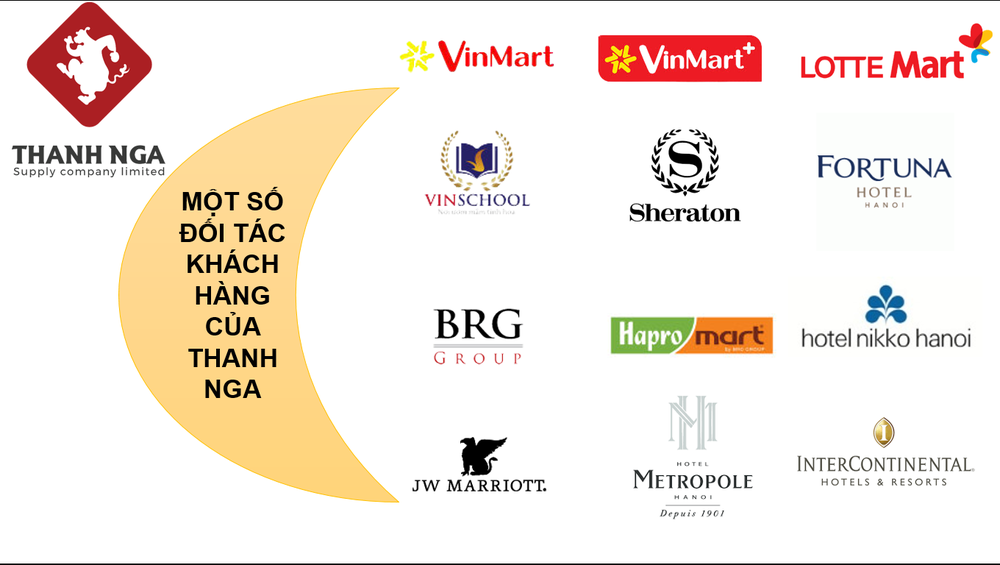 Ngoài ra, Thanh Nga cũng cung cấp số lượng lớn thực phẩm cho hệ thống các chuỗi siêu thị, bệnh viện quốc tế, trường học quốc tế, tòa nhà văn phòng, suất ăn công nghiệp như PSA, Tòa nhà Dầu Khí, VinMart, VinSchool, VinMec, LotteMart, Amsterdam, GateWay, Alaska.... tại Hà Nội và các tỉnh lân cận. Hiện tại do giãn cách các trường học, khách sạn đều đang đóng cửa.