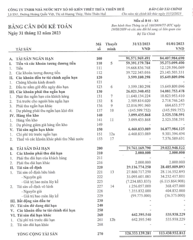 Tại ngày 31/12/2023 Xổ số kiến thiết Thừa Thiên Huế có 128,3 tỷ đồng tổng tài sản, tăng 13,1% so với đầu năm. Nợ phải trả gần 41 tỷ đồng, tăng 11,4%.