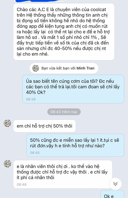 Đặc biệt, có nick tự xưng là chuyên viên của Coolcat nhắn tin riêng từng người với nội dung có thể lấy lại được khoảng 50% tiền mà mỗi khách hàng bị đọng lại trên hệ thống sàn. Điều kiện đưa ra là sẽ mất trước từ 1-3% phí trên số tiền lấy được.