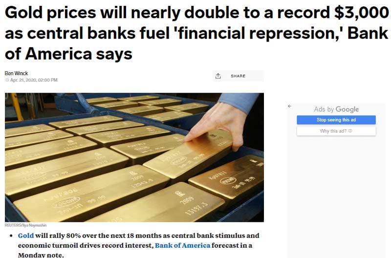 Theo một dự báo vừa được ngân hàng Bank of America đưa ra, giá vàng sẽ tăng gần gấp đôi lên mức cao kỷ lục 3.000 USD/ounce (83 triệu đồng/lượng) trong vòng 18 tháng tới do những động thái nới lỏng tiền tệ và bơm tiền ở mức chưa từng có của NHTW các nước sẽ gây ra một áp lực lớn trên thị trường tài chính.