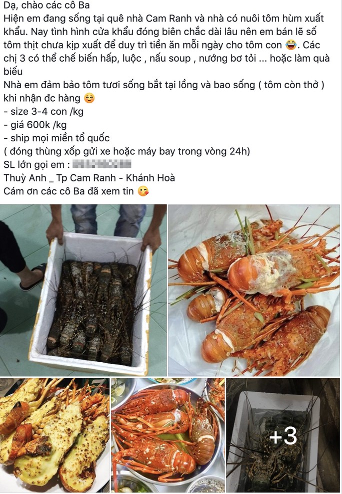 Không chỉ các vựa hải sản treo bảng "giải cứu" tôm hùm mà trên các trang mạng xã hội, nhiều người cũng đua nhau rao bán tôm hùm baby Cam Ranh (Khánh Hòa) với giá dao động 550.000 - 600.000 đồng/kg loại 3-4 con/kg.