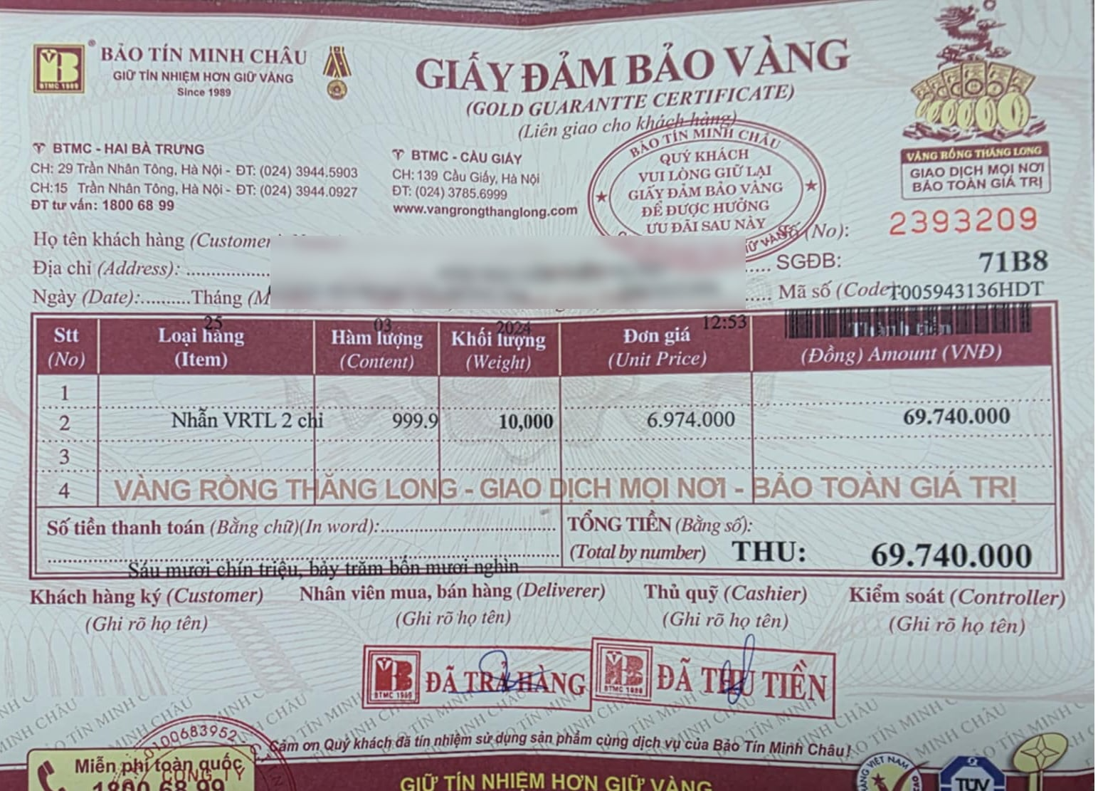 Bố tôi, ngược lại, với kinh nghiệm và sự thận trọng của một người từng trải, chọn mua 1 lượng vàng nhẫn 2 chỉ, loại vàng 9999, với giá 69,7 triệu đồng/lượng.