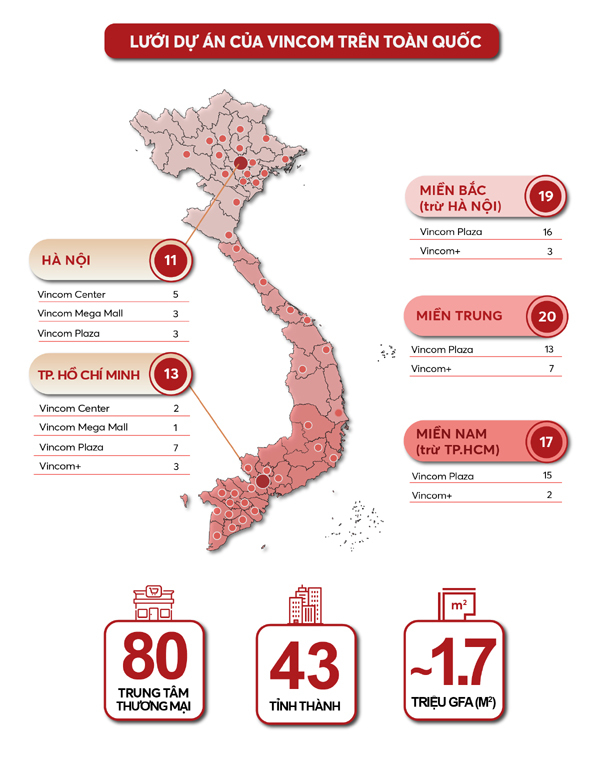Trên con đường mở rộng và phát triển của các thương hiệu quốc tế tại Việt Nam, sự đồng hành của hệ thống TTTM lớn nhất Việt Nam cũng được ghi nhận như một “bảo chứng” vàng. Nhờ lưới dự án rộng và dày trên khắp cả nước, sở hữu vị trí đắc địa và khả năng nhận diện tốt, Vincom luôn được các đối tác quốc tế lựa chọn để hợp tác. Với gần 1,7 triệu m2 mặt sàn bán lẻ cùng 80 TTTM trên toàn quốc trên 43 tỉnh thành, Vincom Retail hiện là nhà sở hữu, phát triển và vận hành TTTM lớn nhất tại Việt Nam với quy chuẩn TTTM và tiêu chuẩn dịch vụ quốc tế.