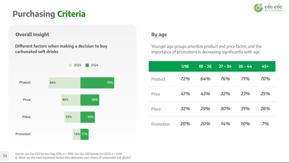 Khi phân tích đánh giá của người tiêu dùng theo 4P (Product - Price - Place - Promotion), các yếu tố thuộc về sản phẩm (như thương hiệu, bao bì, hương vị) được 70% người tiêu dùng coi là yếu tố tác động quan trọng tới quyết định mua hàng. Giá cả xếp thứ 2 với 39%, đặc biệt là với nhóm dưới 26 tuổi. 30% người tiêu dùng sẽ ưu tiên mua hàng ở những nơi dễ mua và có nhiều kênh phân phối. 17% sẽ bị thu hút bởi các chương trình khuyến mãi, giảm giá.