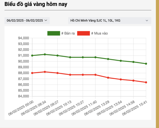 Cuối ngày 6-2, giá vàng miếng SJC tiếp đà lao dốc mạnh. Các công ty SJC, PNJ, DOJI, Bảo Tín Minh Châu đồng loạt hạ giá mua vào vàng miếng SJC xuống còn 86,4 triệu đồng/lượng, bán ra 89,6 triệu đồng/lượng, giảm từ 1,6 triệu đồng tới 1,8 triệu đồng so với giá mở cửa buổi sáng. Một số tiệm vàng bán ra vàng miếng SJC chỉ còn 87,6 triệu đồng/lượng.
