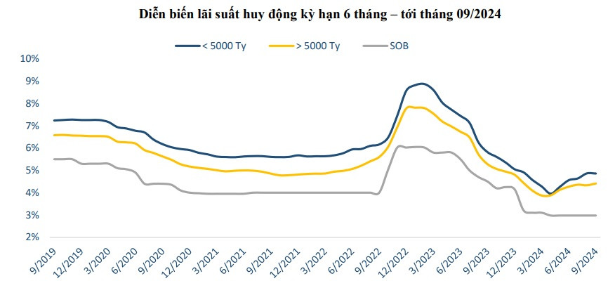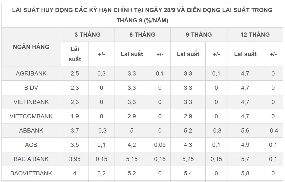 Lãi suất huy động kỳ hạn 9 tháng tăng cao nhất trong tháng 9 là 0,6%/năm diễn ra tại OceanBank và Dong A Bank, trong khi mức tăng tại GPBank là 0,2%/năm, tại Bac A Bank là 0,15%/năm. Mức tăng thấp nhất là 0,1%/năm được thực hiện bởi NCB, OCB, Agribank, và ACB.