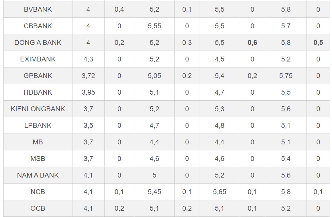 10 ngân hàng còn lại tăng lãi suất trong tháng này gồm: VietBank, GPBank, Agribank, Bac A Bank, NCB, OCB, BVBank, ACB, PGBank, và Nam A Bank.