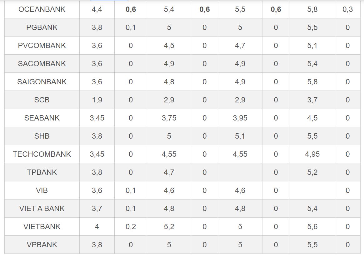 Trở lại với diễn biến lãi suất trong tháng 9, OceanBank là ngân hàng có mức tăng mạnh nhất lên tới 0,6%/năm với kỳ hạn 1-11 tháng và tăng 0,3%/năm lãi suất kỳ hạn 12-15 tháng. Lãi suất tiền gửi kỳ hạn 18-36 tháng cũng được nhà băng này tăng thêm 0,1%/năm lên 6,1%/năm.