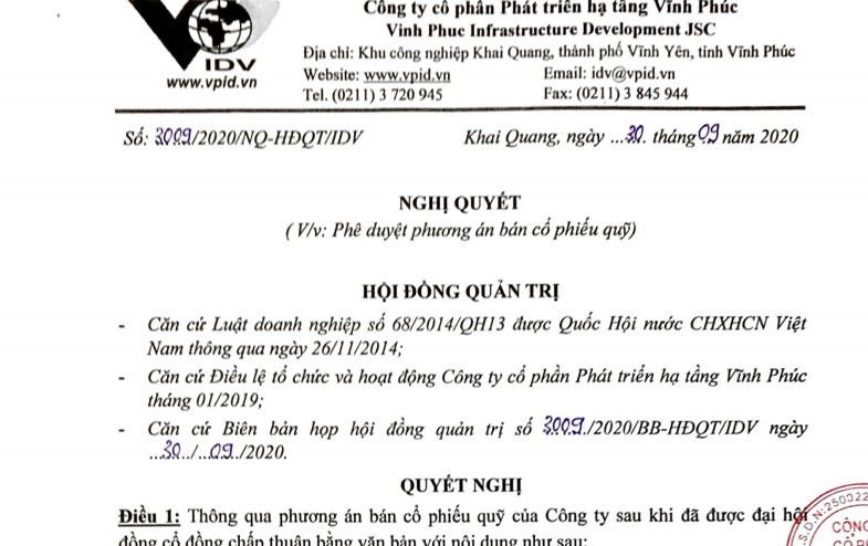 CTCP Phát triển Hạ tầng Vĩnh Phúc (IDV) vừa quyết định đưa 1.020.243 cổ phiếu quỹ ra bán nhằm tăng số cổ phiếu có quyền biểu quyết đang lưu hành và bổ sung vốn kinh doanh.