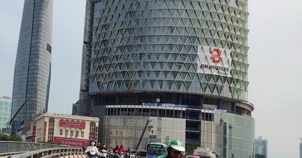 Đến thời điểm này, lớp kính cũ của tòa tháp đã được tháo xuống. Công nhân đang lắp kính mới hình tam giác khổ lớn màu sắc sặc sỡ.