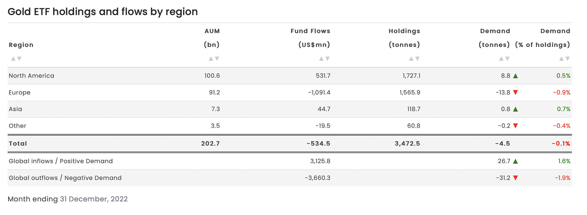 Trong năm 2022, quỹ ETF vàng (giao dịch hoán đổi vàng) bán ròng 3 tỷ USD, tương đương với số vàng vật chất nắm giữ 110 tấn, giảm 3% so với cùng kỳ.