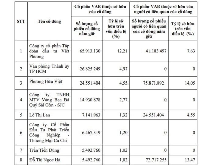 Theo danh sách công bố, 4 nhà đầu tư tổ chức và 4 nhà đầu tư cá nhân đang sở hữu từ 1% vốn điều lệ của Viet A Bank.