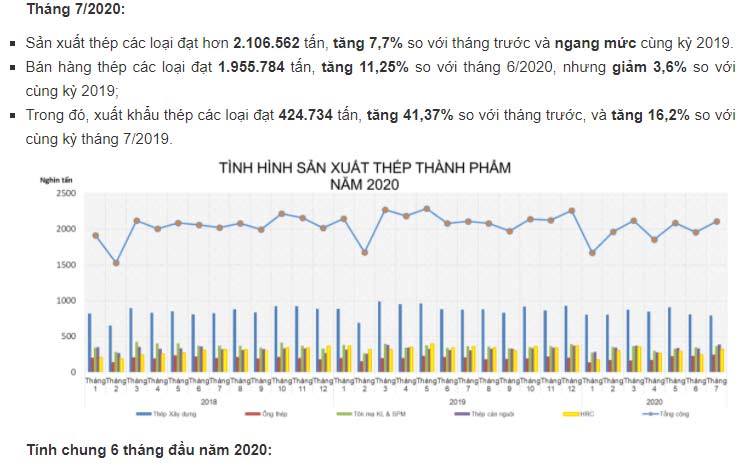 Theo VSA, tính riêng trong tháng 7, sản xuất thép các loại trong nước đạt hơn 2,1 triệu tấn, tăng 7,7% so với tháng trước và ngang mức cùng kỳ 2019 bất chấp khó khăn vì Covid. Thép các loại bán ra đạt gần 1,956 triệu tấn, tăng 11,25% so với tháng 6 nhưng giảm 3,6% so với cùng kỳ 2019. Trong đó, xuất khẩu đạt 424,7 nghìn tấn, tăng 41,37% so với tháng trước và tăng 16,2% so với tháng 7/2019.