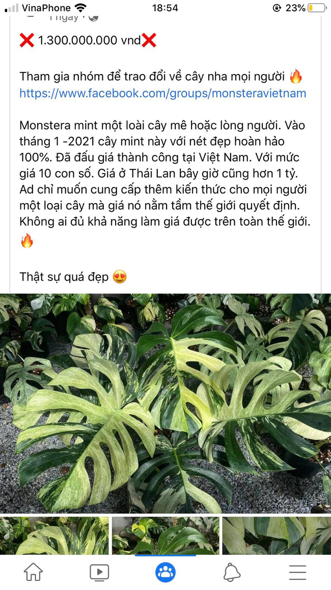 "Monstera mint một loài cây mê hoặc lòng người. Vào tháng 1/2021 cây mint này với nét đẹp hoàn hảo 100%. Đã đấu giá thành công tại Việt Nam. Với mức giá 10 con số. Giá ở Thái Lan bây giờ cũng hơn 1 tỷ", bài đăng giới thiệu về cây Monstera khiến nhiều người kinh ngạc.