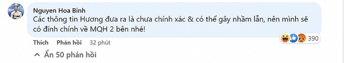 Cụ thể, Shark Bình bình luận: "Các thông tin Hương đưa ra là chưa chính xác và có thể gây nhầm lẫn nên mình sẽ có đính chính về mối quan hệ 2 bên nhé".