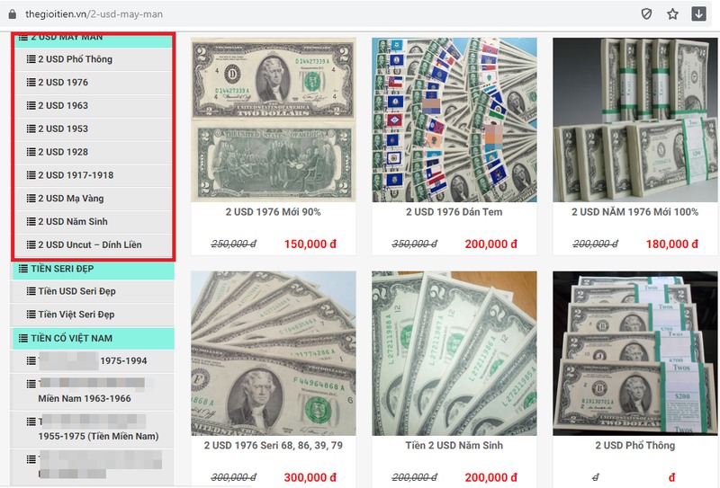 Trong khi đó, trên thị trường online hàng loạt website sẵn sàng “cung cấp” cho khách hàng những đồng tiền 2 đôla Mỹ đẹp, như: doitienle, doitienmoi, 2usdonline, dichvudoitien, thegioitien, 2usdshop. Giá bán sẽ giao động khoảng từ 52 nghìn đồng đến 600 nghìn đồng/tờ, tùy theo series và năm in ấn của đồng tiền.