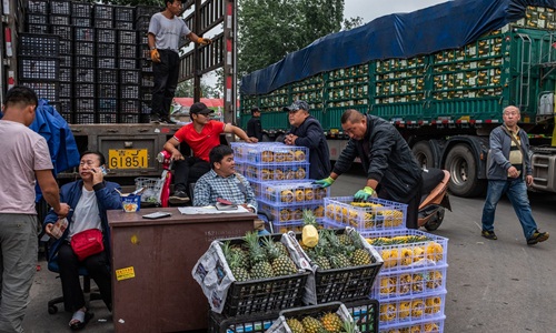 Công việc kinh doanh thường luôn nhộn nhịp tại chợ đầu mối Tân Phát Địa ở phía nam thủ đô Bắc Kinh, Trung Quốc, nơi cửa hàng, quán ăn và khách hàng thường mua bán trái cây, rau củ bằng thùng, còn các chủ sạp luôn bận rộn.