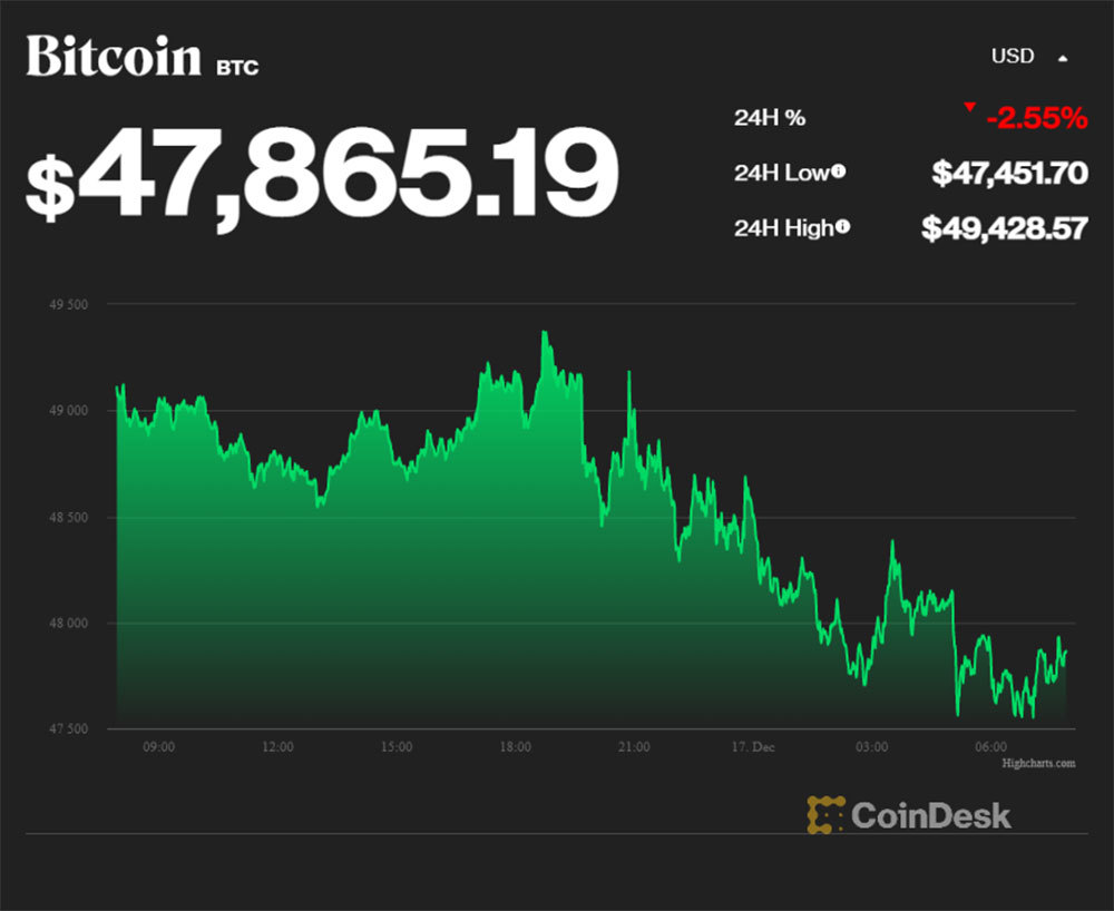 Ngày hôm qua (16/12), đồng Bitcoin đã gần tiến tới mốc quan trọng 50.000 USD. Tuy nhiên, sáng nay (17/12), giá Bitcoin lại lao dốc xuống mốc 47.000 USD.