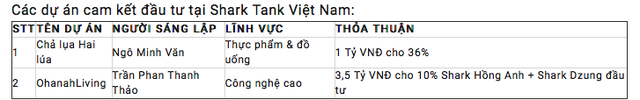 Theo đó, vị Shark khách mời này đã đầu tư vào 2 dự án startup là "Chả lụa Hai Lúa" và OhanahLiving. Sau chương trình, trong năm 2019, cả hai đều có những bước phát triển rất tốt.
