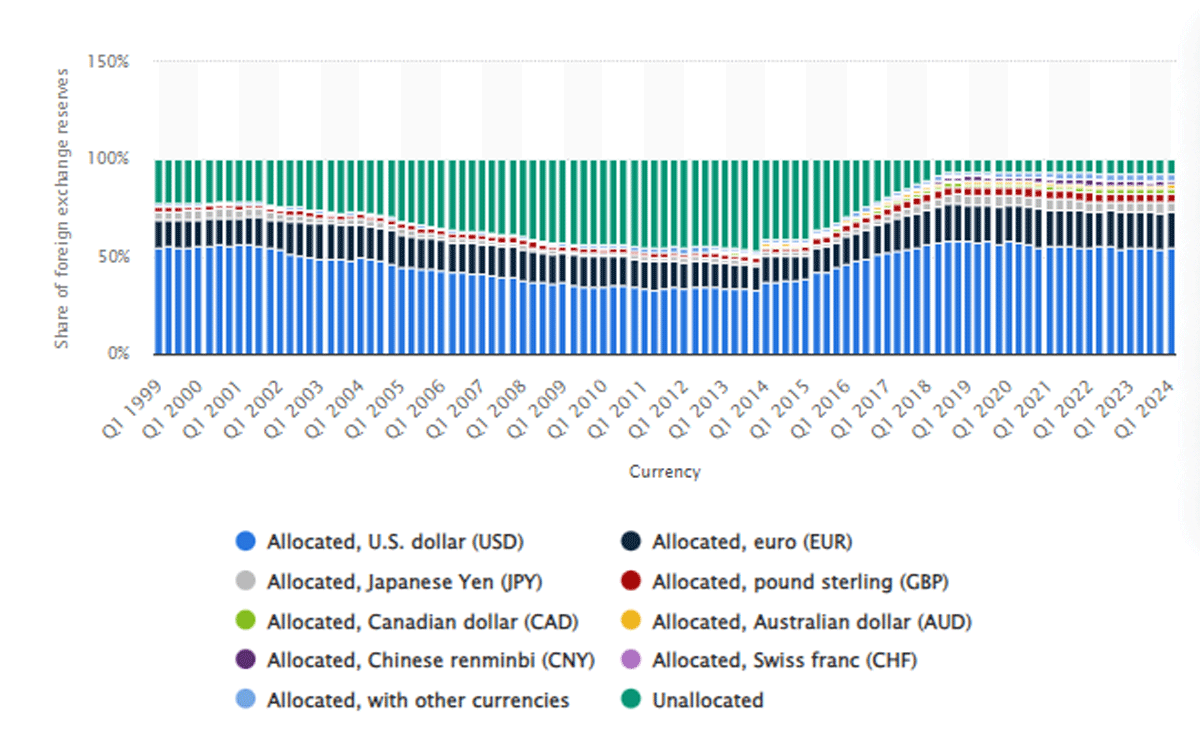 Trong thời gian tới, khi USD bước vào chu kỳ giảm giá, dự trữ ngoại hối của thế giới bằng đồng bạc xanh của Mỹ có thể còn giảm tiếp. Nó có thể tác động mạnh tới hoạt động thanh toán trên thế giới, làm giảm giá trị USD và theo lý thuyết sẽ gây lạm phát phi mã tại Mỹ.