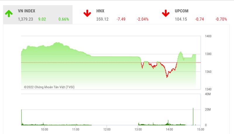 Phiên giao dịch cuối tuần (22/4), chỉ số VN-Index tăng 9,02 điểm, tương đương 0,66%, đóng cửa ở mức 1.379,23 điểm. Trên sàn HNX, chỉ số HNX-Index kết thúc tuần giao dịch này tại mức 359,12 điểm – giảm 7,49 điểm, tương đương 2,04%.