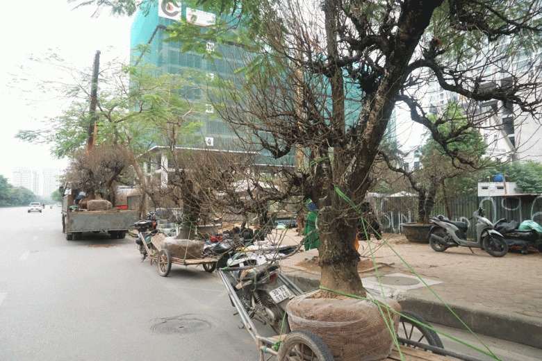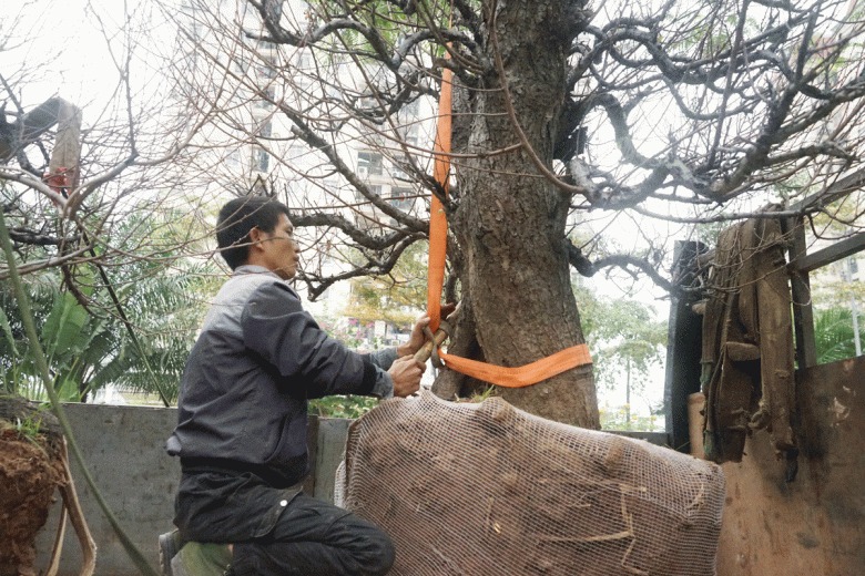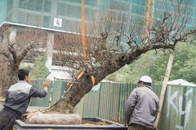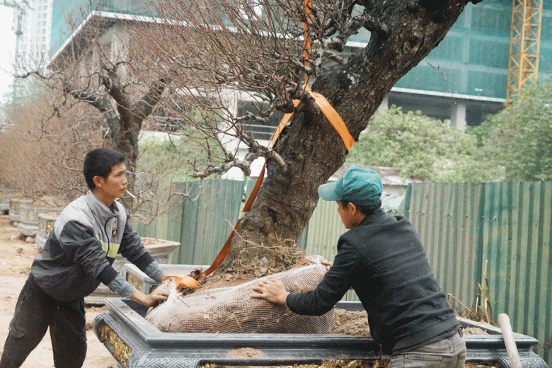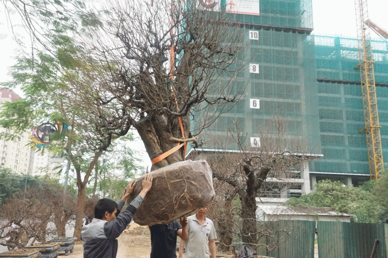 Một số nhà vườn có những gốc đào cổ thụ hiện đã chuyển ra các địa điểm để chào bán. Đáng nói, những nhà vườn này đầu tư chi phí rất lớn để thuê đội nhân công chăm sóc, thuê thiết bị máy móc nhằm vận chuyển những gốc đào cổ thụ được nhanh và an toàn nhất.