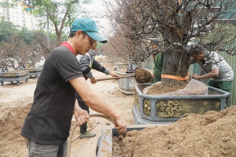 “Nếu như những gia đình khác chỉ dùng xe lôi, xe kéo đưa đào ra phố thì tôi thuê hẳn ô tô, máy cẩu để cẩu rồi cho đào “bay” xuống vỉa hè, lắp đặt vào ang cẩn thận và chăm sóc tiếp. Bởi những gốc đào của tôi đều có tuổi đời vài chục năm, giá trị lớn nên chỉ sơ sẩy 1-2 gốc là coi như mất Tết”, anh Hoàn chia sẻ.