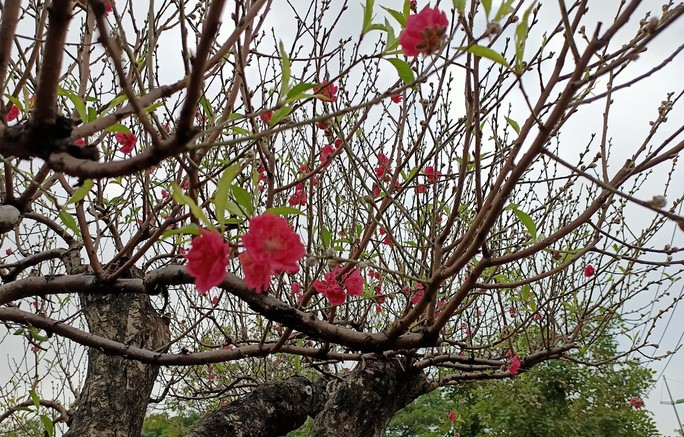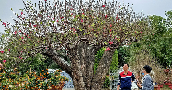 Một gốc đào hàng chục năm tuổi, có dáng thế "bàn tay lộc" đang được hét giá gần 100 triệu đồng tại chợ hoa Tết Nhâm dần 2022.