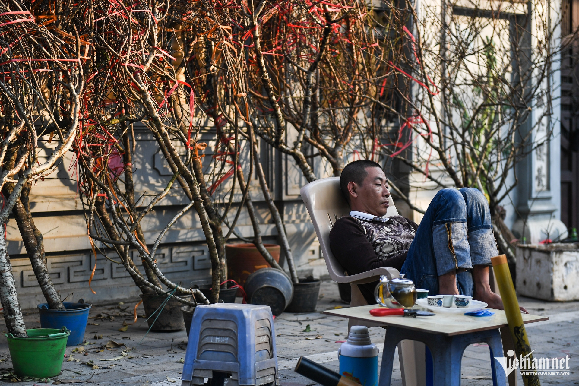 Nam tiểu thương đang ra sức thuyết phục khách hàng nhưng sau đó cũng không bán được cành đào nào.