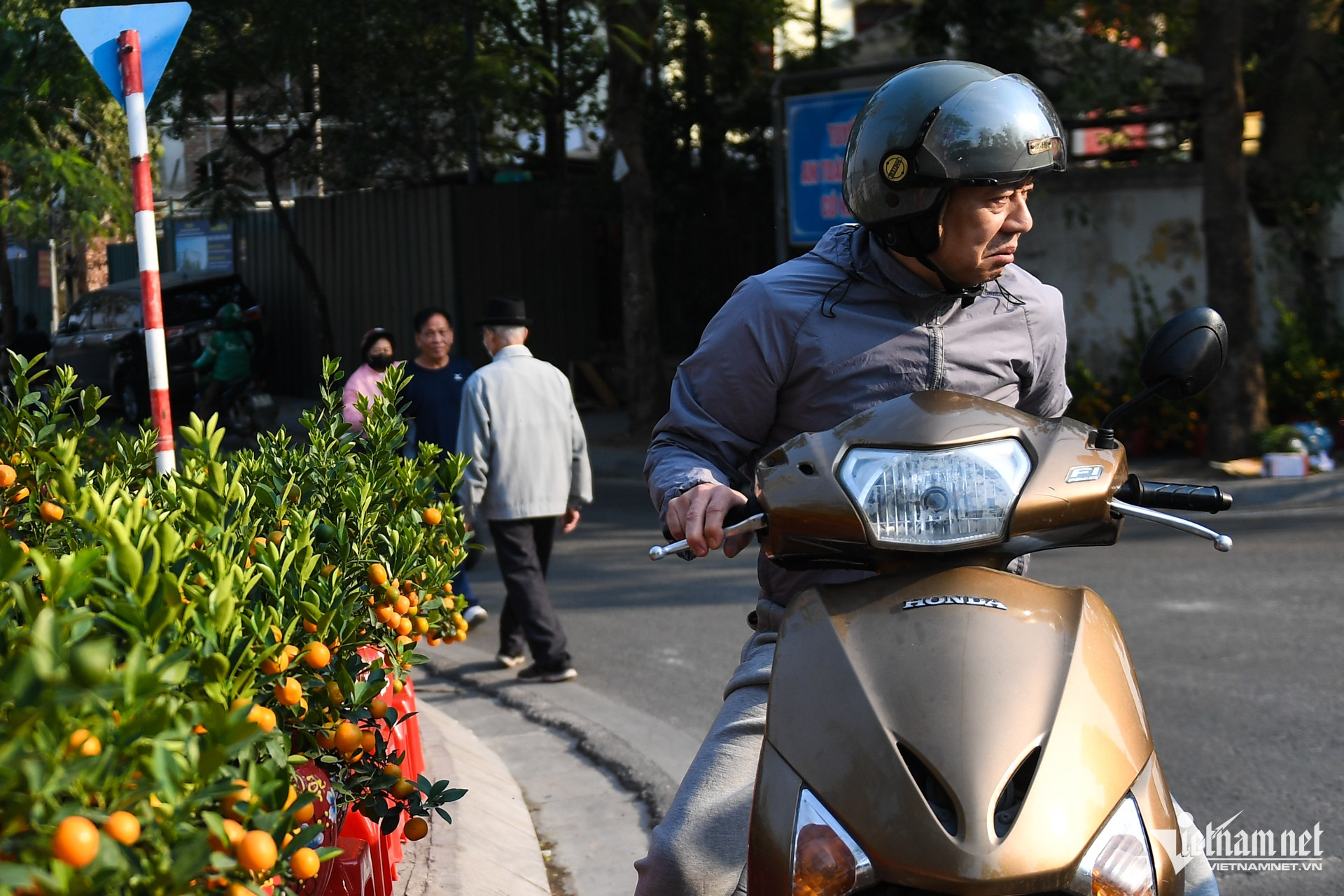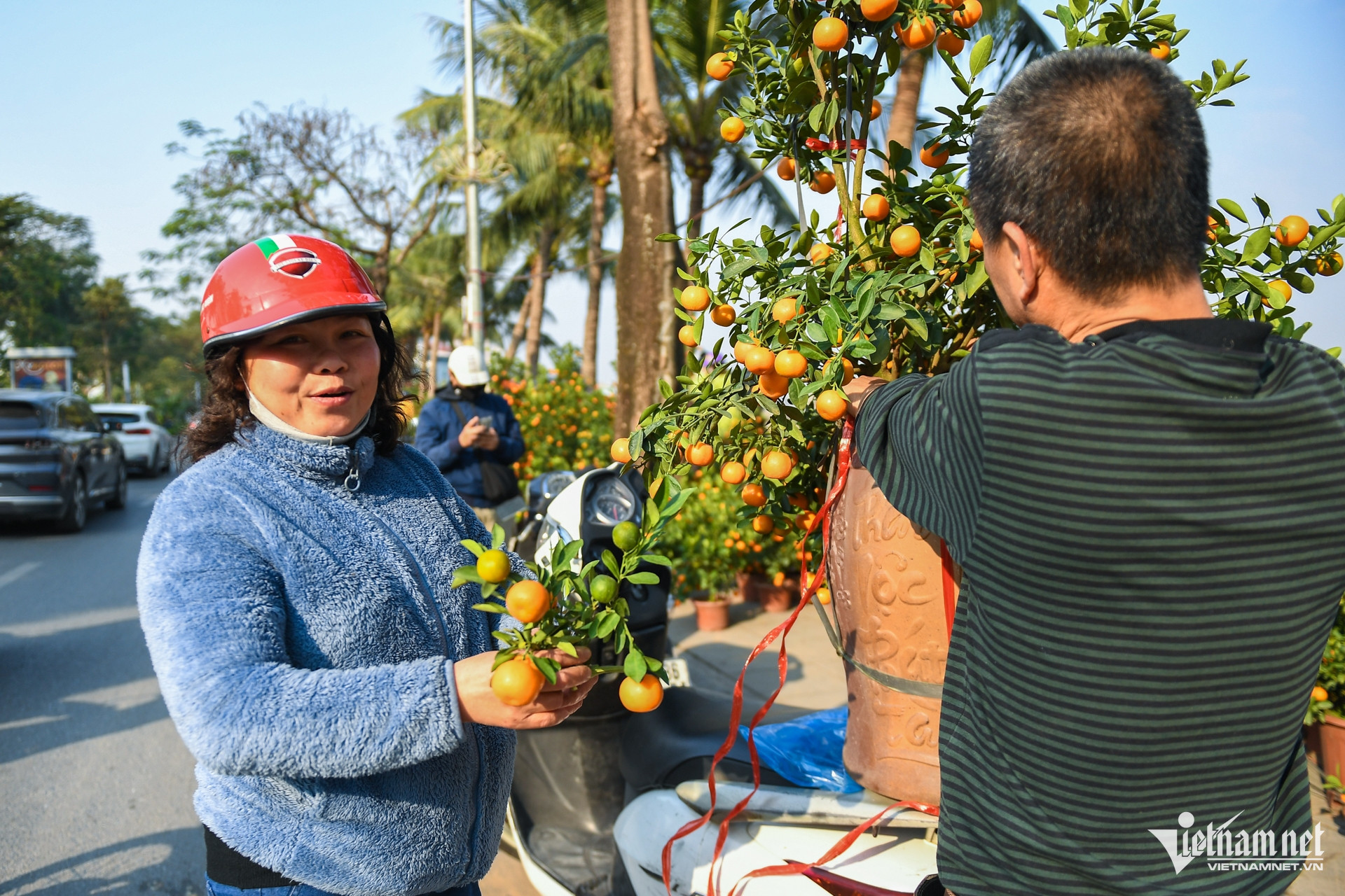 Công Vinh (bên trái, tiểu thương) vừa bán được chậu quất cho khách với giá 200.000 đồng. "Tôi đã phải giảm giá, thuyết phục mãi rằng giá quất để bàn của tôi gần như rẻ nhất tại đây, cây vẫn còn đang có hoa khách mới chịu lấy. Dù đã chọn cẩn thận từng cây tại vườn quất Tứ Liên nhưng vẫn thực sự khó bán", Vinh nói.