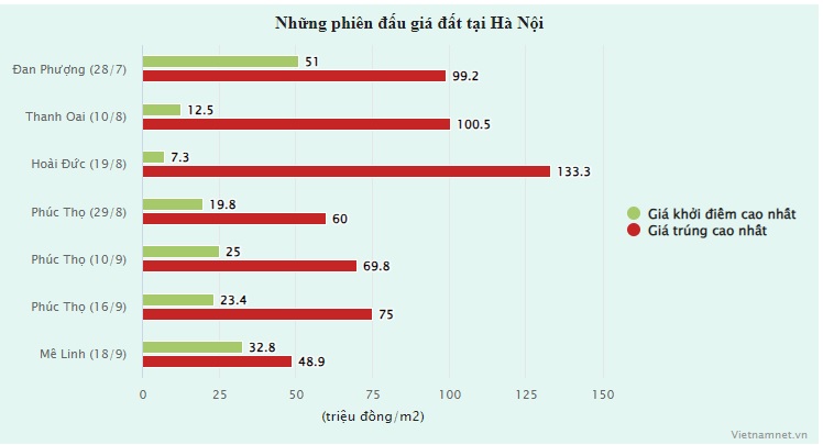 Đến ngày 18/9, phiên đấu giá 32 lô đất tại thôn Bạch Đa, xã Kim Hoa, huyện Mê Linh đã cắt chuỗi giá trúng cao nhất trên 50 triệu đồng/m2 duy trì hơn một tháng qua. Tại phiên đấu giá này, giá trúng cao nhất là 48,9 triệu đồng/m2, chưa tới gấp đôi giá khởi điểm.