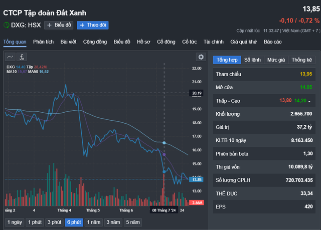 Trên thị trường chứng khoán, cổ phiếu DXG có sự sụt giảm từ mức gần 21.000 đồng vào đầu tháng 4-2024 và hiện chỉ còn chưa tới 14.000 đồng/cổ phiếu.
