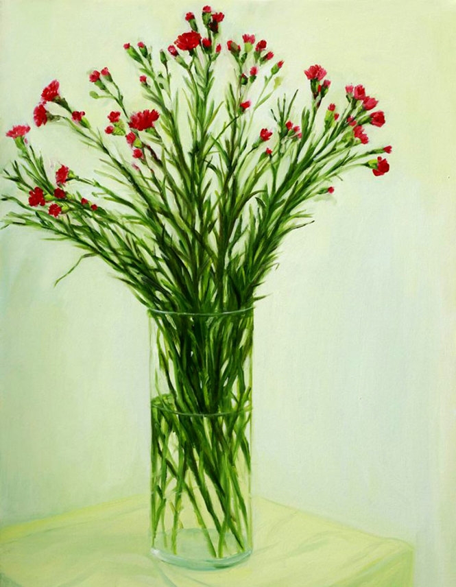 Bức tranh Cẩm chướng và họa sĩ Nguyễn Ngọc Đan - Ảnh: NVCC |