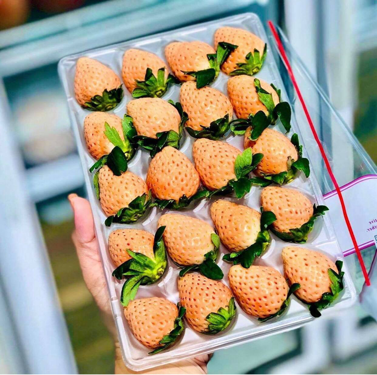 Được người bán quảng cáo khác hẳn với những loại dâu tây đỏ thường thấy, dâu tây anh đào đến từ Nhật Bản có màu phớt hồng như cánh hoa anh đào, các mắt trên quả dâu có màu đỏ, khi ăn có vị thơm ngọt như kẹo, giàu Vitamin A, C, E, các chất chống lão hóa, tăng chất xơ và ít calo.