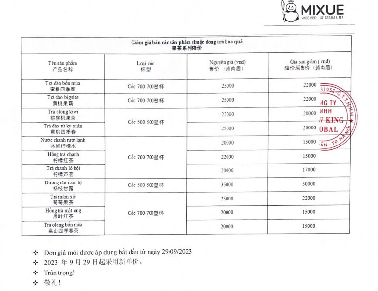 Mixue yêu cầu giảm giá rất đột ngột với sản phẩm trà hoa quả. Và mức giảm giá từ 15-25% thì chủ cửa hàng không thể nào có lãi.