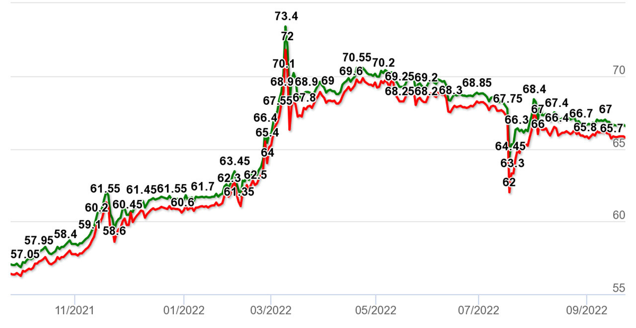 Kết thúc phiên 24/9, giá vàng miếng 9999 tại SJC Hà Nội là 65,8 triệu đồng/lượng (mua vào) - 66,6 triệu đồng/lượng (bán ra). SJC TP.HCM niêm yết ở mức 65,8 triệu đồng/lượng (mua vào) và 66,62 triệu đồng/lượng (bán ra).